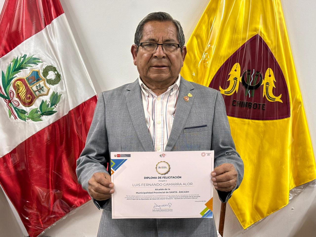 El MIDIS otorgó dos diplomas de felicitación al alcalde. El primero, por el cumplimiento de metas en los indicadores de la Primera Edición del Distintitivo por la Promoción de Servicios para el Desarrollo Infantil Temprano «Apuesta por la Primera Infancia».