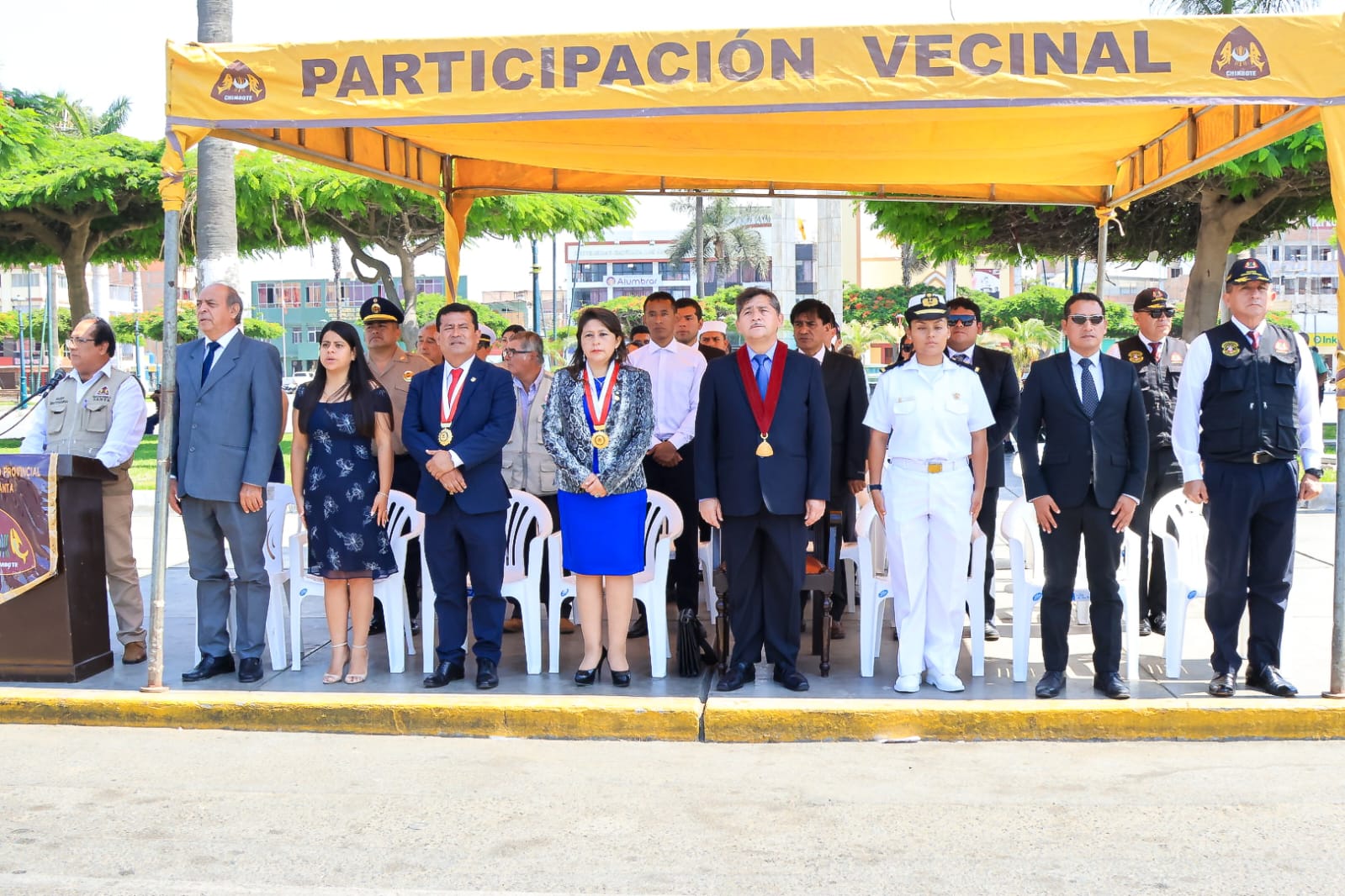 El regidor Elmer Gamarra Mendoza, en representación del burgomaestre provincial, presidió la ceremonia cívica, en el que tuvo el honor de izar el pabellón nacional el primer vicedecano de dicho gremio profesional Orlando Bermúdez García con el acompañamiento del representante de la Marina de Guerra del Perú y de la Capitanía de Puerto de Chimbote.